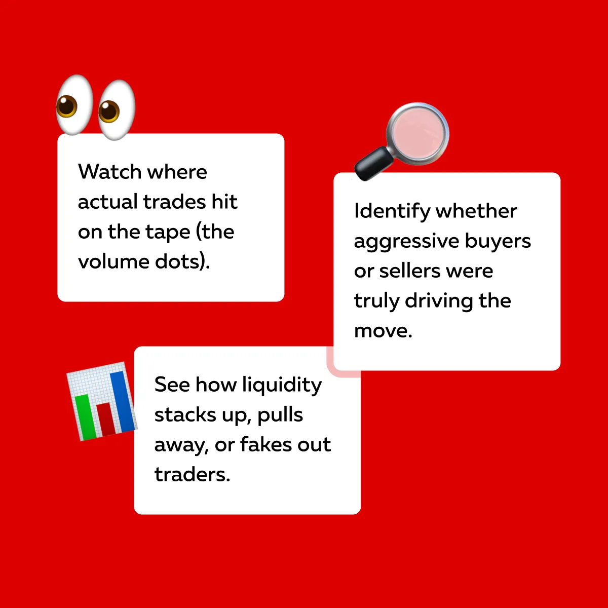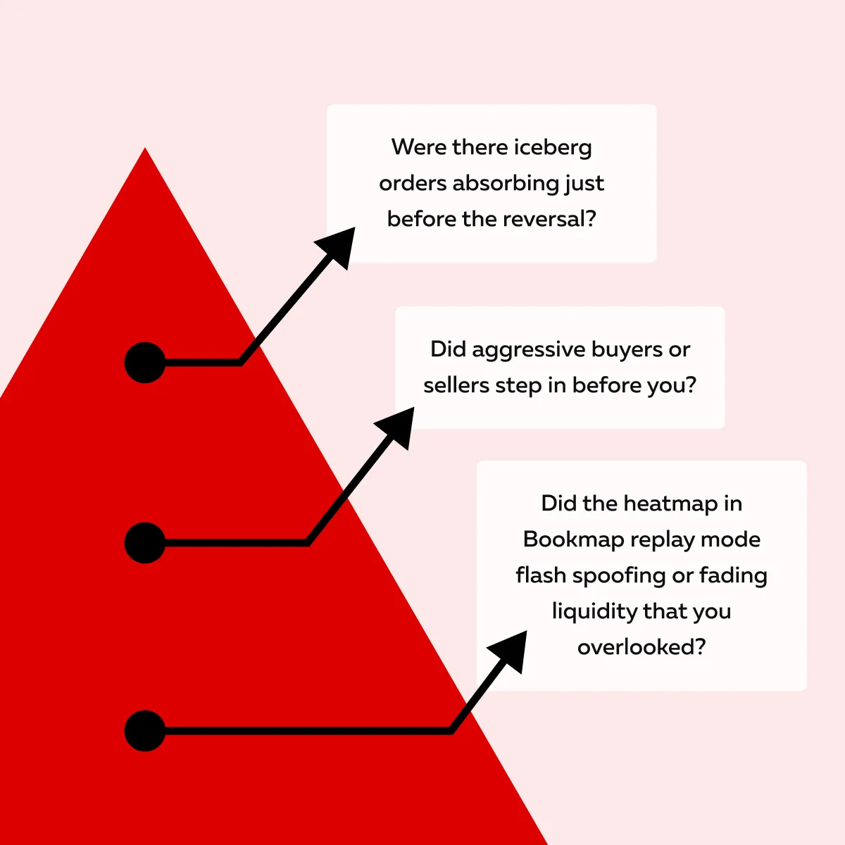Was the trade idea even part of your system? Or did you take it impulsively? | Did you jump in too early, chase it late, or enter right in the middle of a stop run? | Did bigger players support the move, or did momentum stall quickly? | Were your key levels backed by resting orders, or did liquidity disappear right when you needed it? |