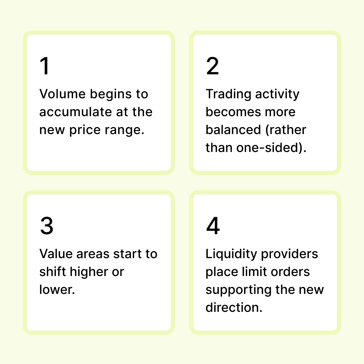 - Migrating value areas indicate gradual acceptance at new price levels.