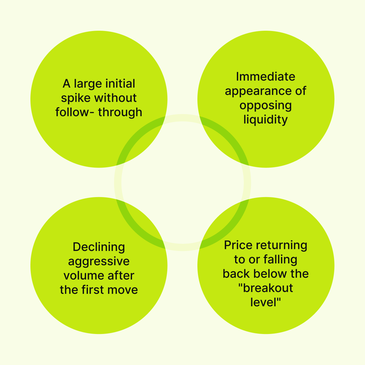 These signals show structural continuation rather than temporary imbalance. On the contrary, if we talk about “failed continuation”, it follows a different pattern. The initial breakout lacks sustained support. Some common signs here are illustrated below: