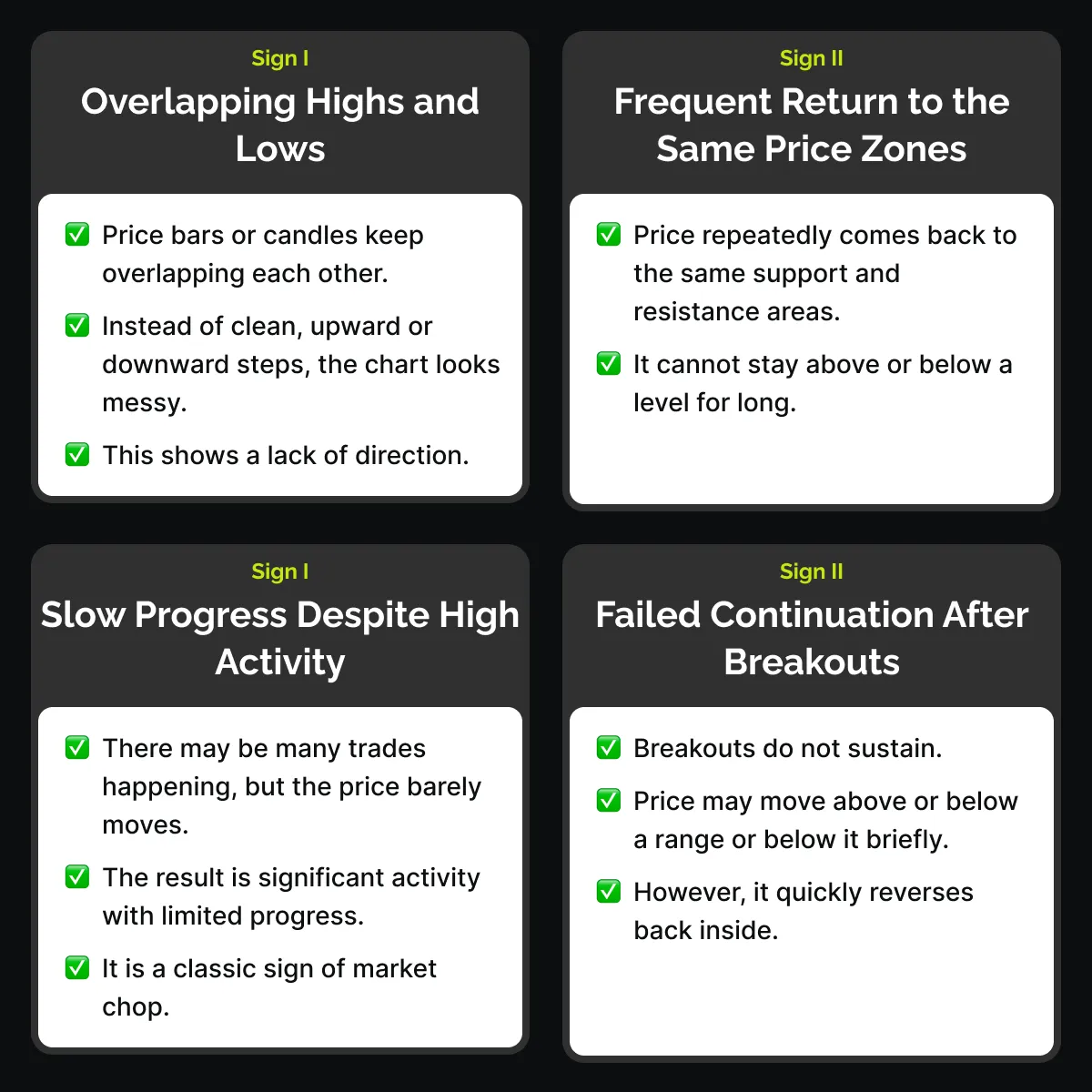 Choppy markets can be identified by recurring structural patterns. Below are four signs commonly observed: