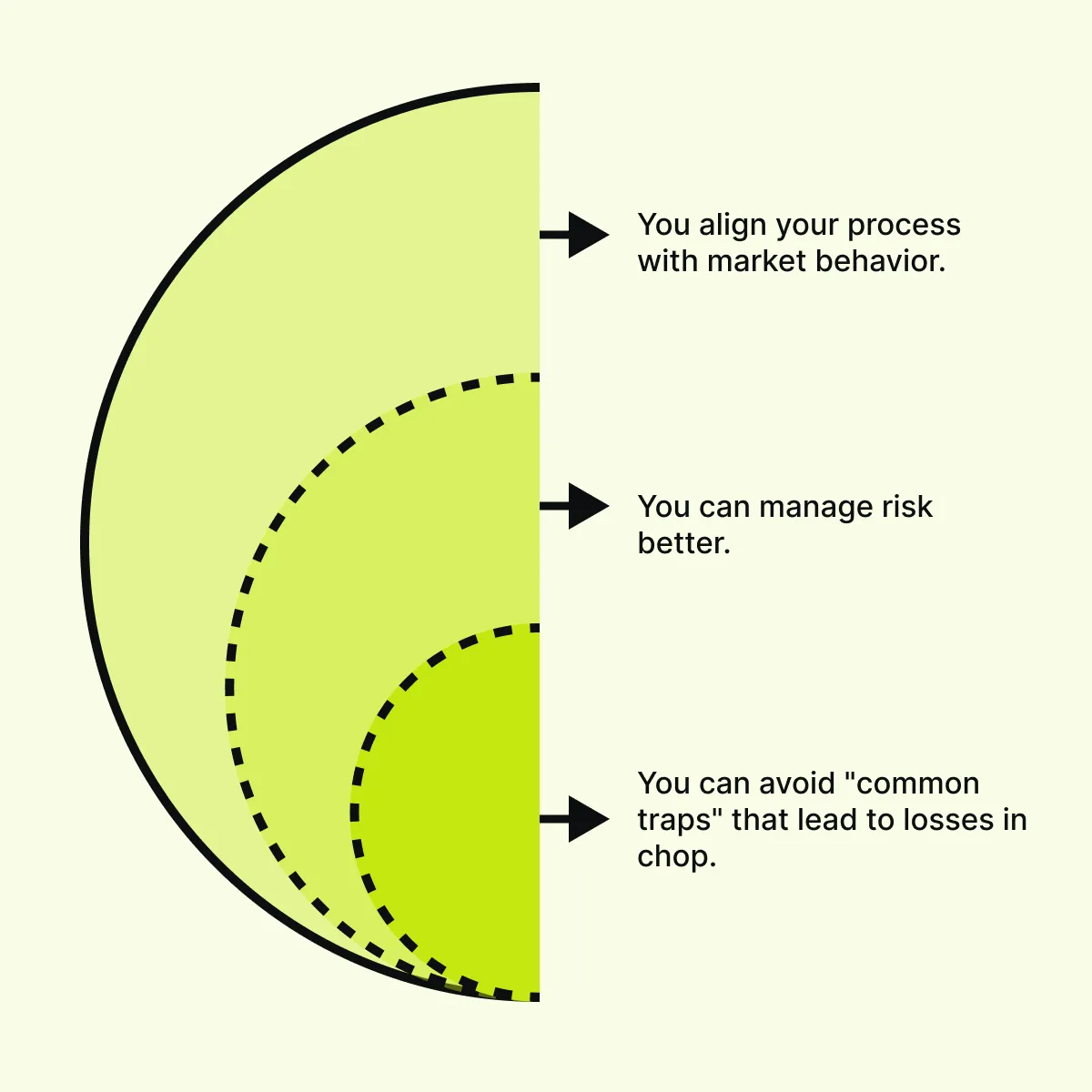 A strong trading process isn’t just related to when to enter. Instead, it also defines when not to trade. In choppy markets, this is particularly important because taking trades in the wrong conditions can: