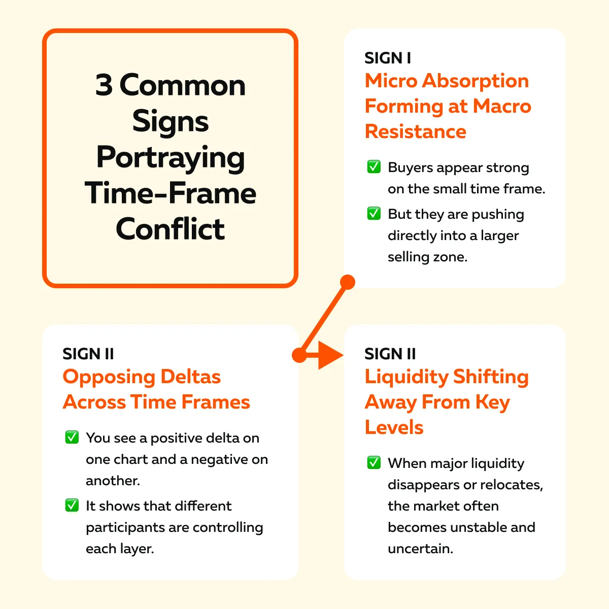 Order flow on its own can be misleading. Why? The same absorption or delta signal can mean different things depending on where it happens. A multi-time-frame context allows you to interpret that signal correctly.