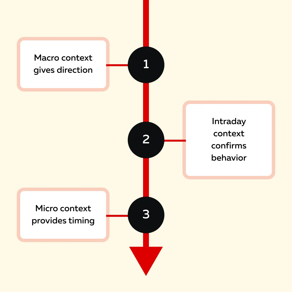 Always remember that each layer of context influences the others. When the macro, intraday, and micro contexts all point in the same direction, you gain a statistical edge in your trades. However, when these contexts conflict (for example, a short setup on the 1-minute chart transitions directly into a higher-time-frame support area), the trade loses its edge even if it appears technically perfect.