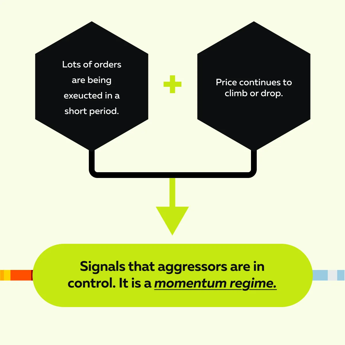 A momentum market looks and feels very different from mean reversion! Instead of slowing down, price speeds up and keeps pushing in one direction. Let’s see some other ingredients of the momentum regime: