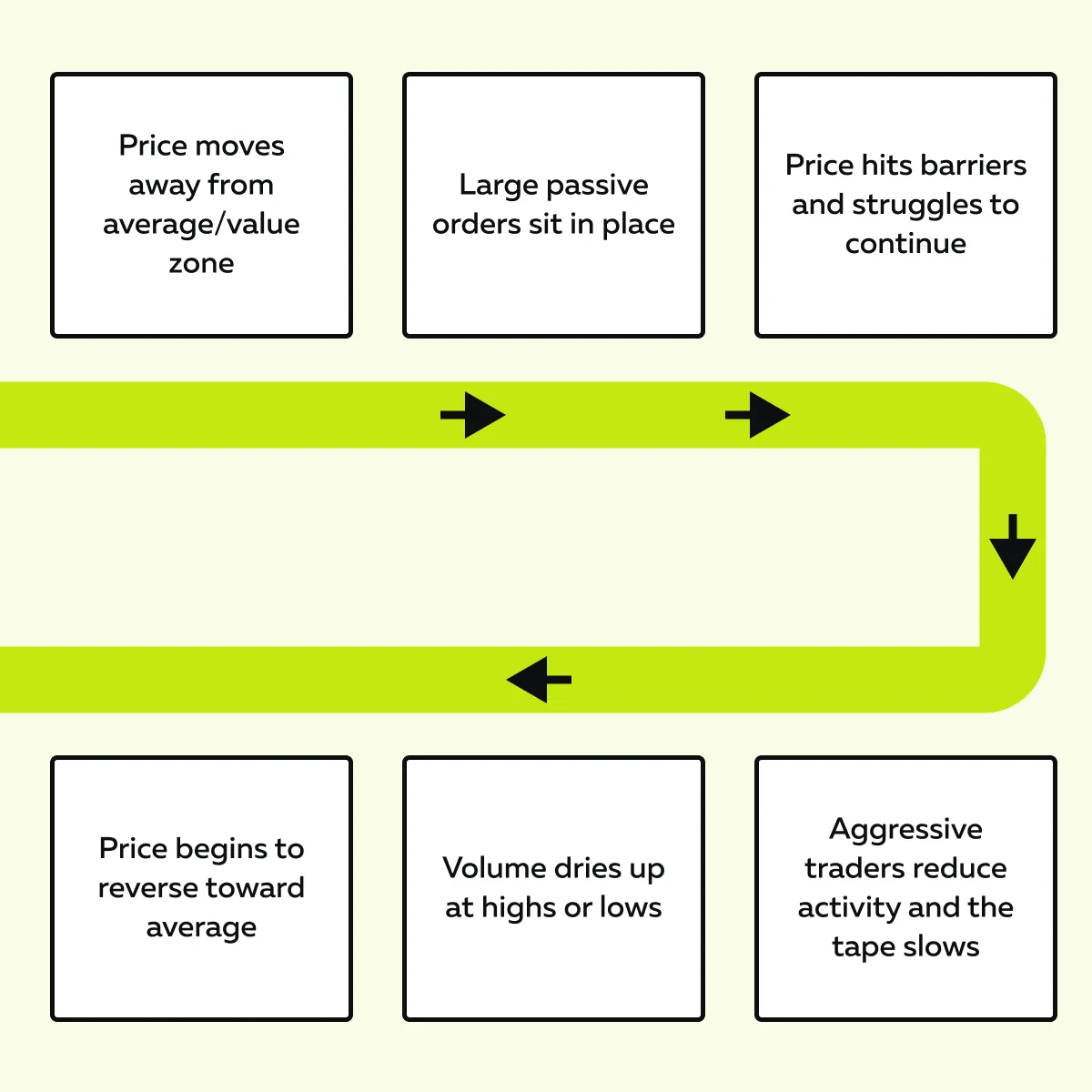 Do you know what happens when price drifts too far from its range? – The tape slows down! Fewer aggressive orders hit the market, and volume dries up at highs or lows. Without the urgency of aggressive trades, momentum fades and aggressors lose control. That’s when the market is more likely to mean-revert than extend.