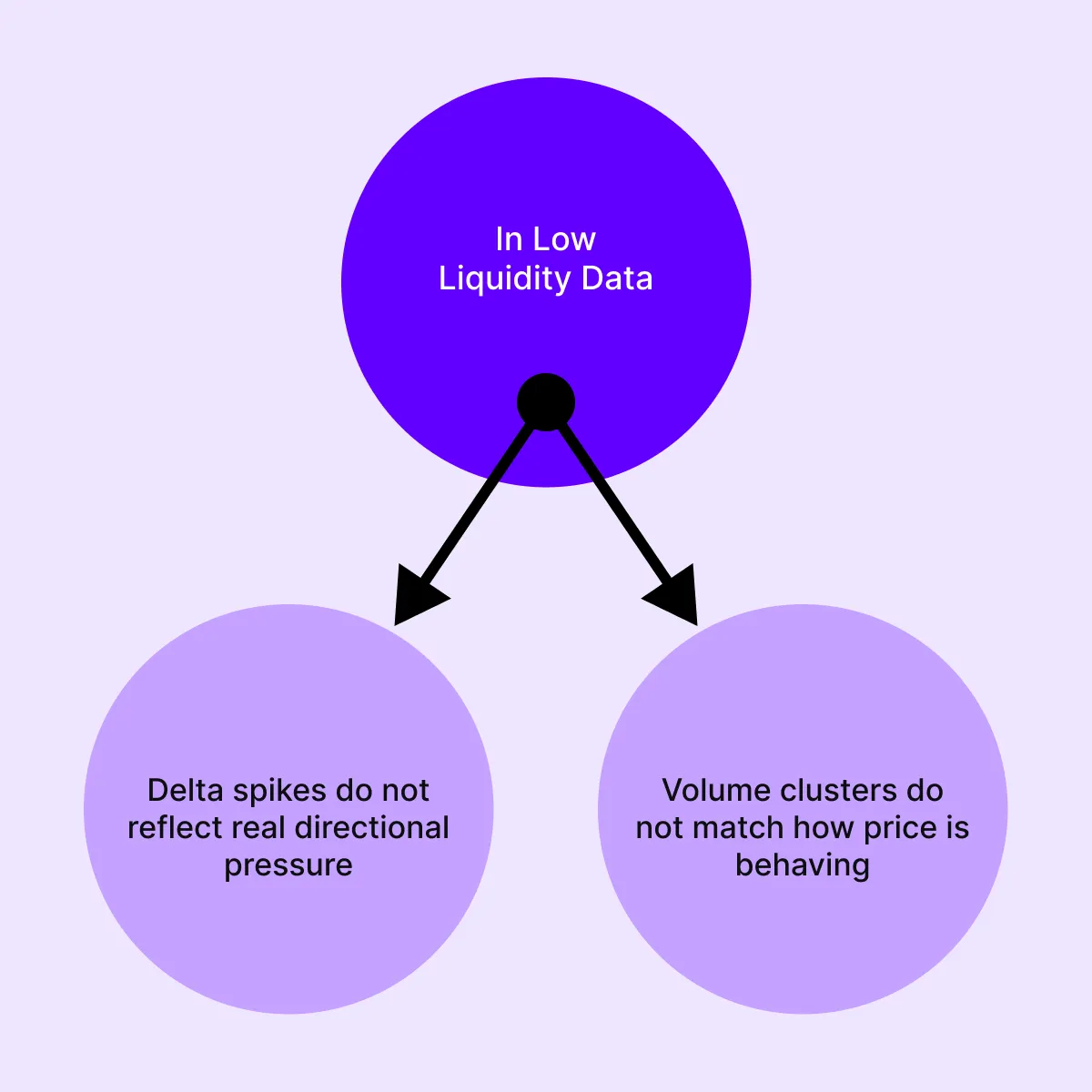 A thorough reading of this article should have made it clear that order flow does not fail without a reason. When traders struggle to read the market, the problem is the data behind it. Poor-quality order-flow data leads to “distorted signals,” indicating unclear liquidity.