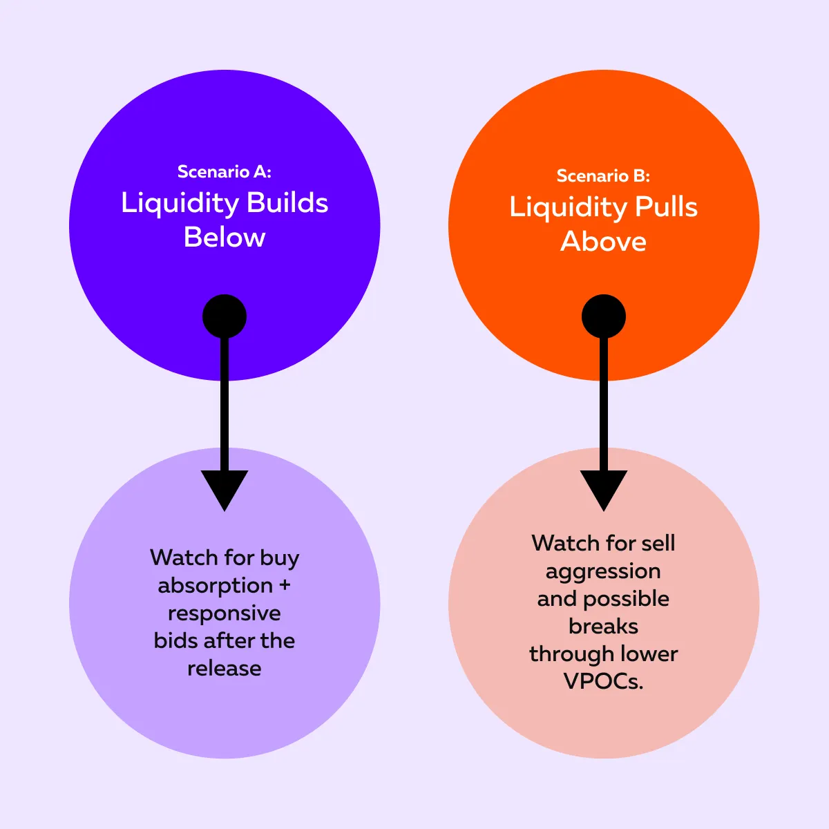 Remember, your goal isn’t to predict the headline. Instead, it is to anticipate the reaction path. Watching how liquidity moves just before the release helps you form scenario-based plans. Let’s see how: