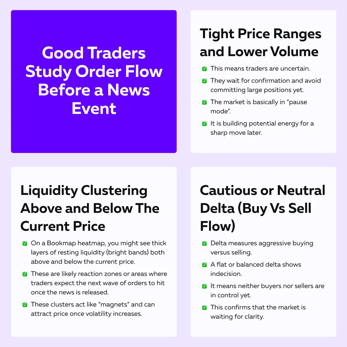So, how can it be made easy? Stop guessing what the headline will say. Instead, you should try to understand how the market will respond to the moment new information appears. This estimation can be made by tracking order flow, which gives you that inside view. Order flow shows you when liquidity disappears, when large players are absorbing, and where traders are getting trapped.