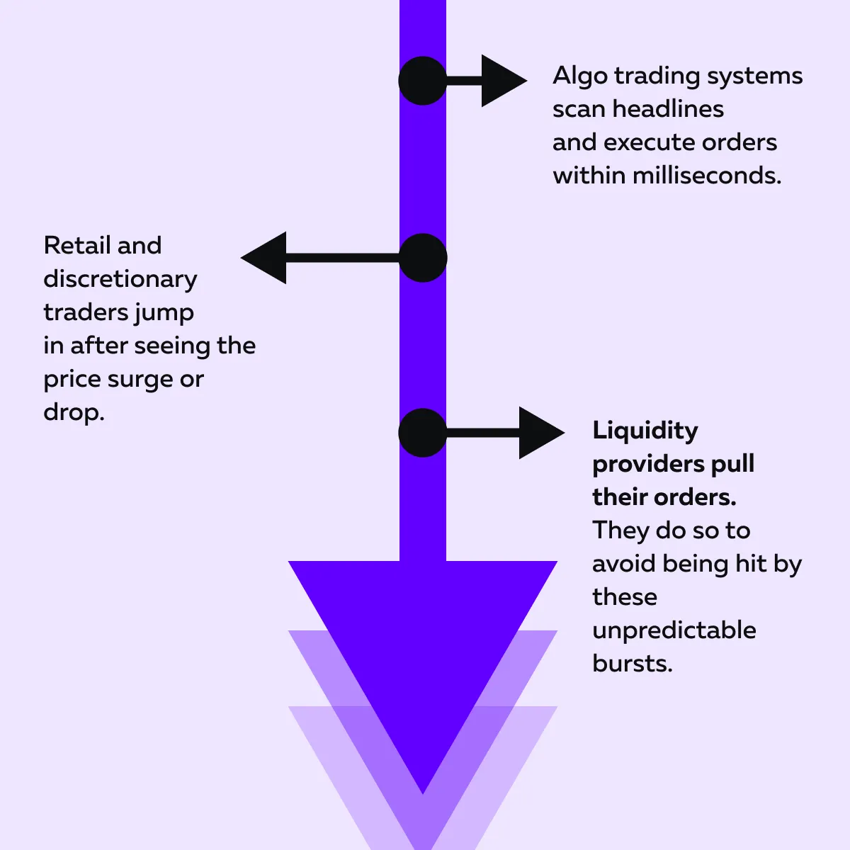 When trading news with order flow, the first few seconds and minutes after a headline are crucial. That’s because algorithms and large participants react instantly when tariff-related news breaks, such as a new tariff increase or rollback. Let’s explore how this happens: