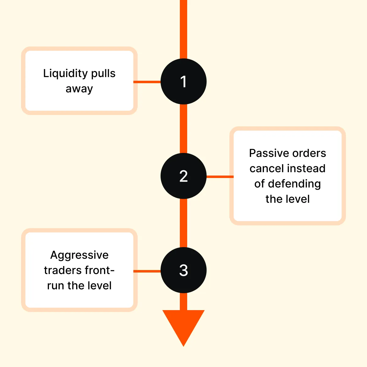 | Resting liquidity pulls away as the price approaches. | Buy or sell limit orders disappear from the order book near the level. | Traders are canceling orders instead of defending the price. | Without resting orders, there is no support or resistance to absorb pressure. Thus, the price can move through easily. |