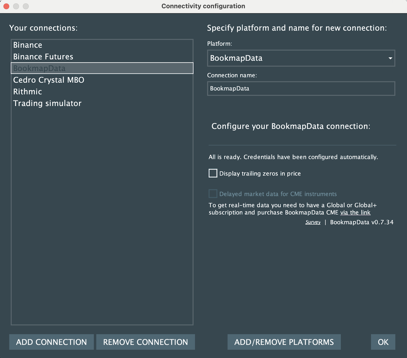 First, let's connect to BookmapData. If you haven't set up the BookmapData adapter yet, you can follow the steps described here.