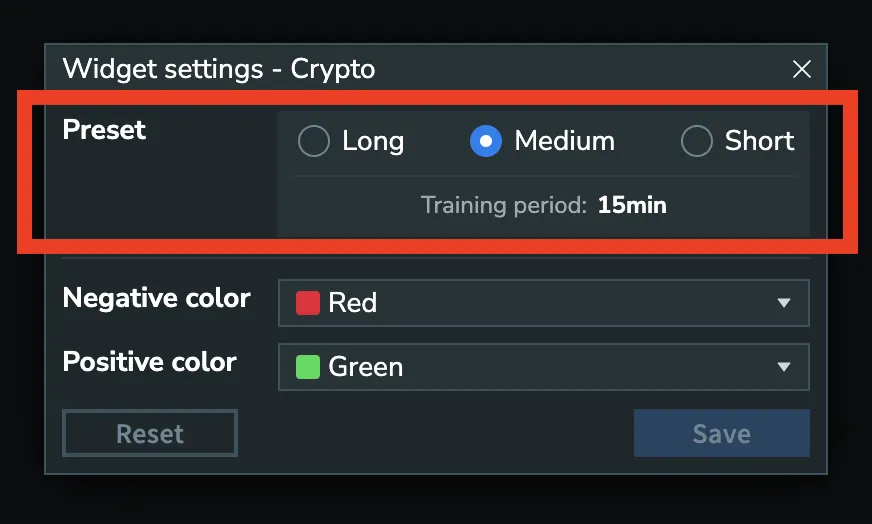 Each algorithm tracks the deviation from the standard situation on the market. Thus, it can provide alerts when the market moves beyond the normal bounds. The thresholds for such “normal” movement can be defined by users by simply moving the “Threshold” bar. To identify which situation is normal, the algorithm should pick the historical interval for the comparison. In the widget configuration popup, you can select this period yourself: