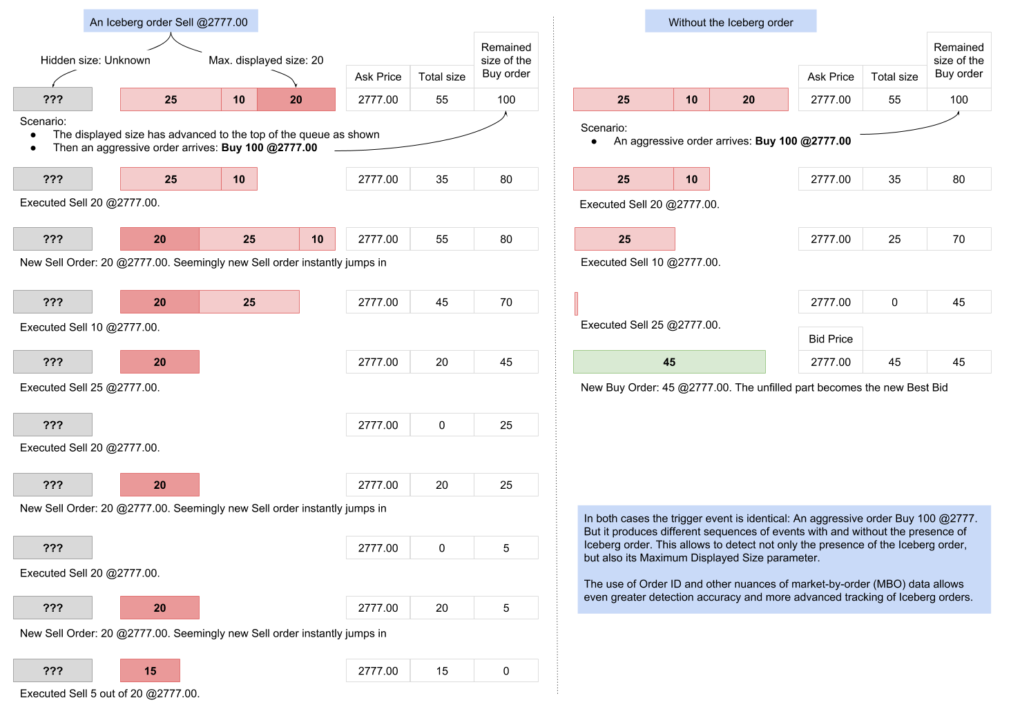 - The presence of an Iceberg order may be detected when its displayed size gets executed.