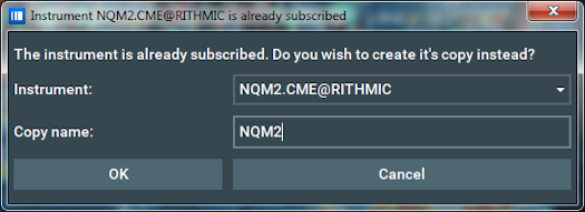 The second way of creating a copy is to use the traditional method of subscribing to symbols. When you subscribe to a symbol for the second time, and if the Instrument Copy add-on is activated, Bookmap will suggest that you create a copy of that instrument, as shown below.