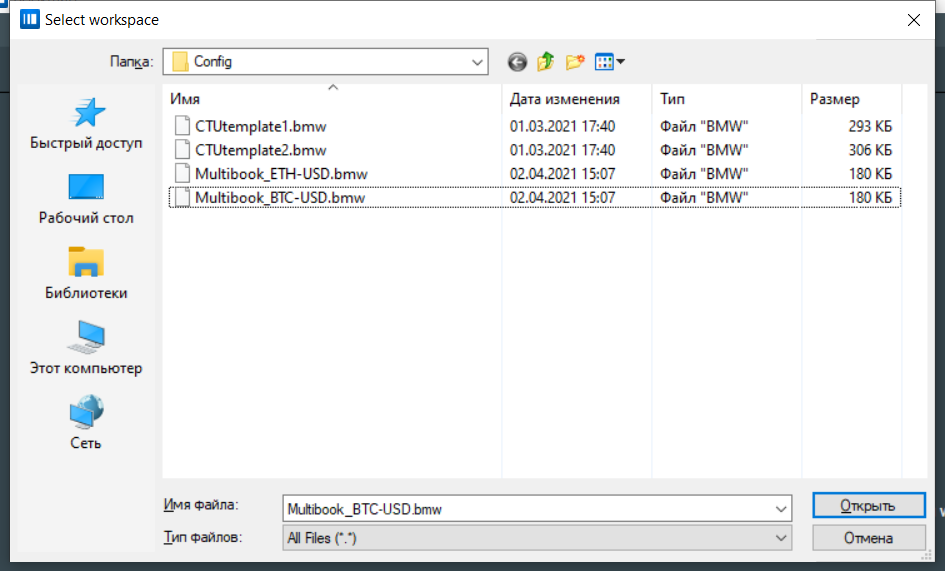 If you install Multibook with version 7.3, you can easily switch between ETH-USD and BTC-USD default workspaces. Just go to File menu → Open workspace and select the workspace you need.