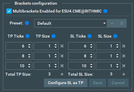 The Brackets configuration panel contains information about the bracket tiers that will be created after order execution. TP/SL ticks define how many price levels will be used for the bracket tier offset. TP/SL size defines how many contracts will be distributed to each specific tier.