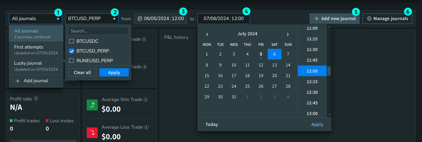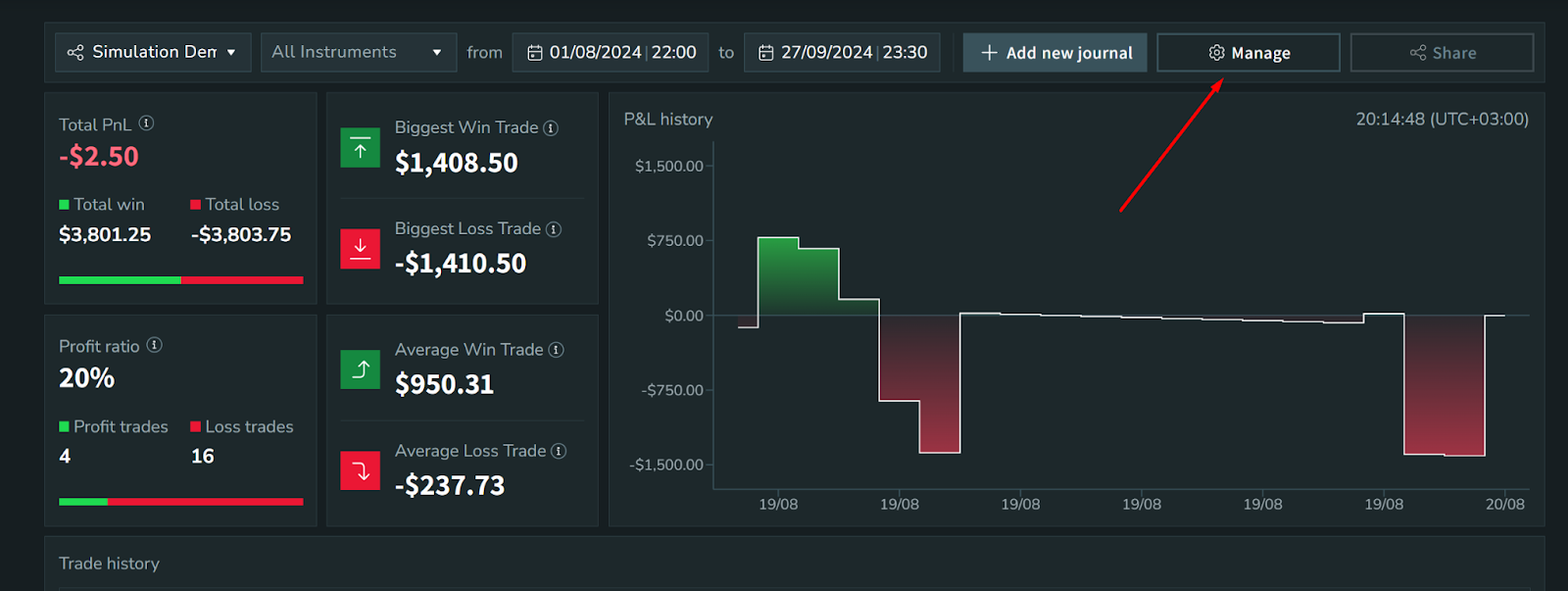 - Filters and Time Range: You can easily find specific trades by applying filters for time ranges, instruments, and journals. This allows you to focus on the data that matters most to you.