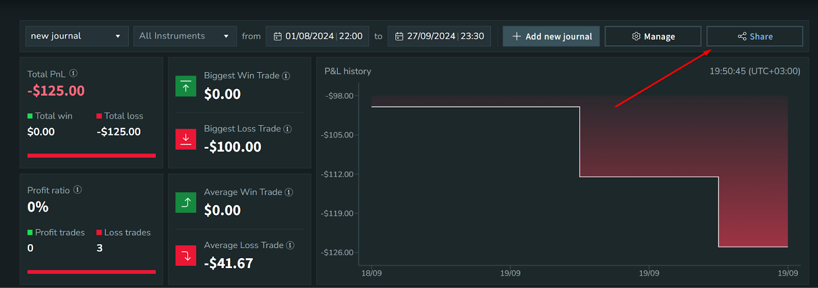 - Journal sharing: Share your journal with other journal users to get valuable insights and feedback on your trading performance.