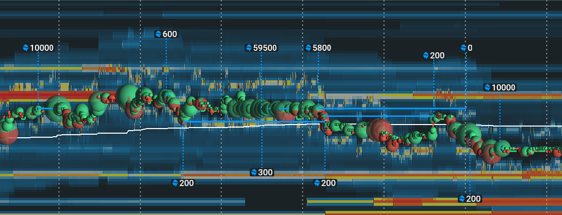 With both icons, you will see a thick horizontal line, marking a price on the chart where the order was active. If this line changes its orientation to vertical in some places, it means that the iceberg order was moved to another price level where the line indicates. All event icons are pinned to that line with thin vertical dotted lines.