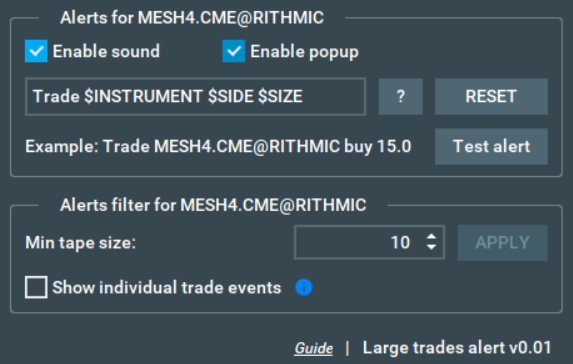 You can choose what trade size should be filtered for alerts - simply select the minimum tape size for which you want to display the alert and click APPLY. After that, you will receive an alert as soon as the tape size is equal to or greater than the one you specified.