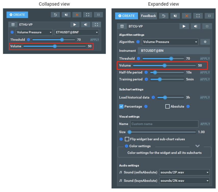 • Values for the Volume Pressure and Volume Pressure Imbalance algorithms are now displayed in the total amount for the current currency for the instrument (size * price).