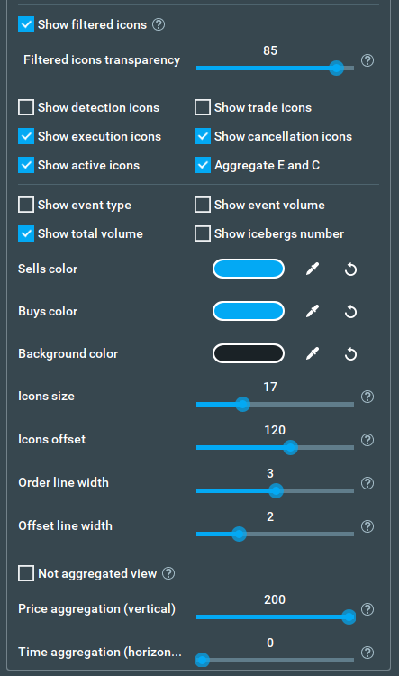 Price aggregation (vertical) and Time aggregation (horizontal) set the size of the (invisible) rectangular area surrounding each iceberg icon, where all other iceberg icons inside the area will be aggregated into one. The numbers here set minimal distance in pixels between the icons on which they start aggregating.
