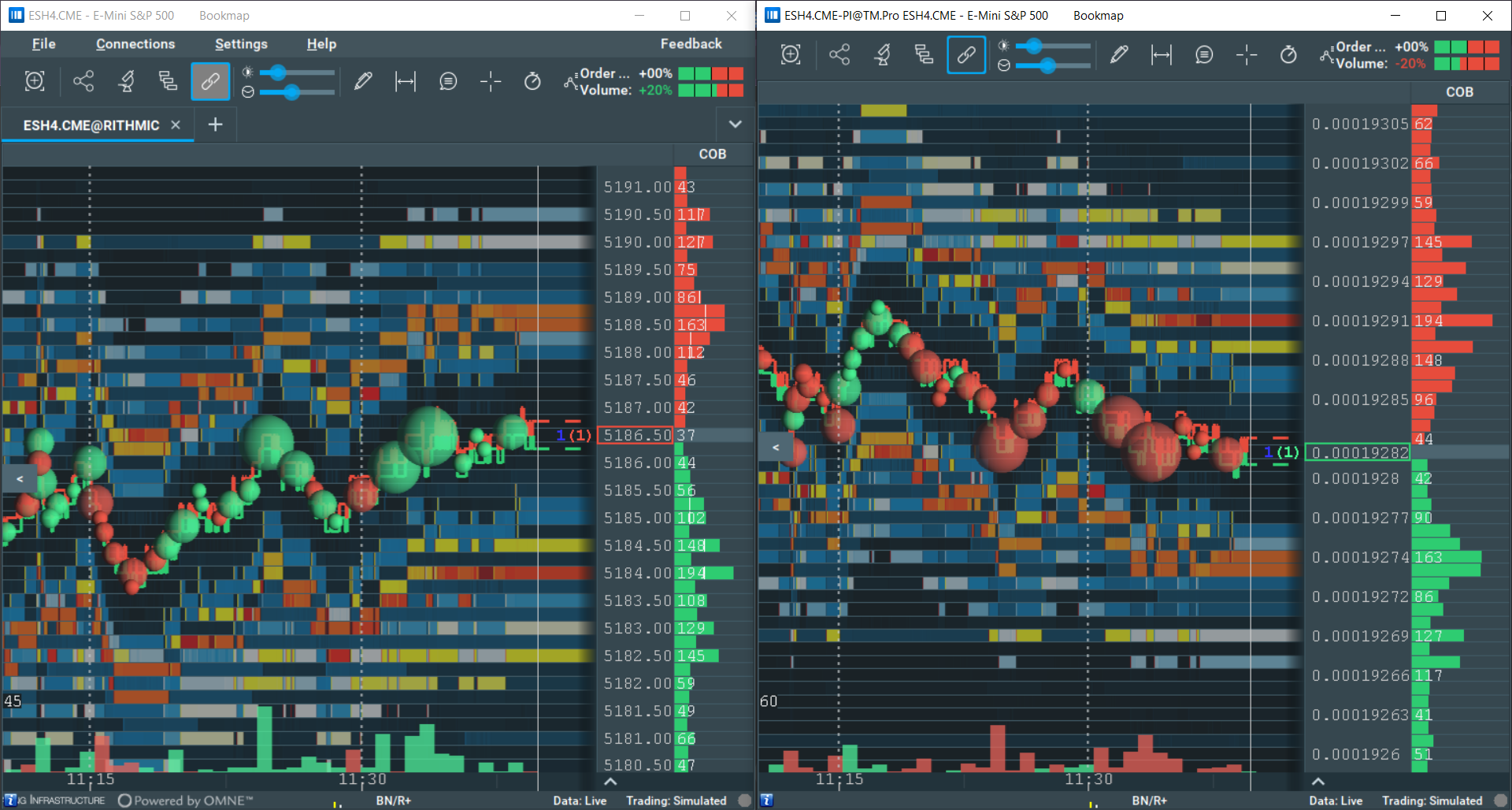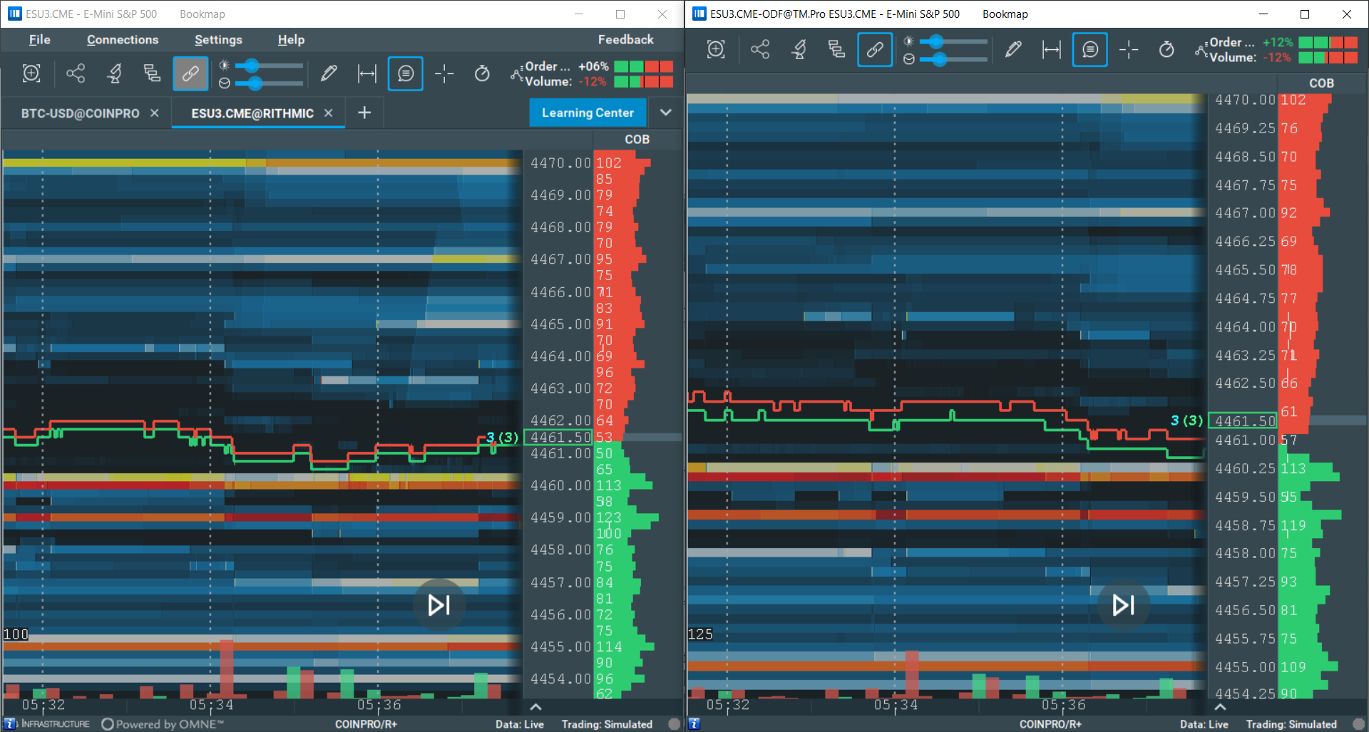 Example: In the image below you can see the original instrument (on the left) compared to the instrument with the Number of orders per price filter applied (on the right). The COB column on the Number of orders per price chart now represents the number of orders, Whereas the original instrument shows you the total size (sum of) of the orders on price level.