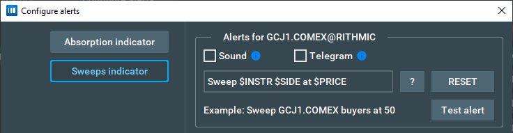 1. Sweeps indicator "Sound alert" settings disappear when switching between add-ons in the "Configure alerts" window. If it happens, just close the window and open it back to restore the functionality.