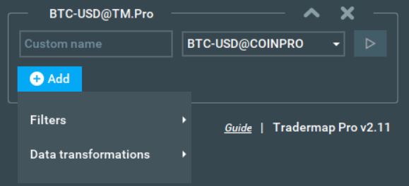 To add a filter to an instrument in a Tradermap Pro chart simply open its tab, go to the Tradermap Pro configuration panel, click the "Add" button, and then pick one of the filters or data transformators from the drop-down list: