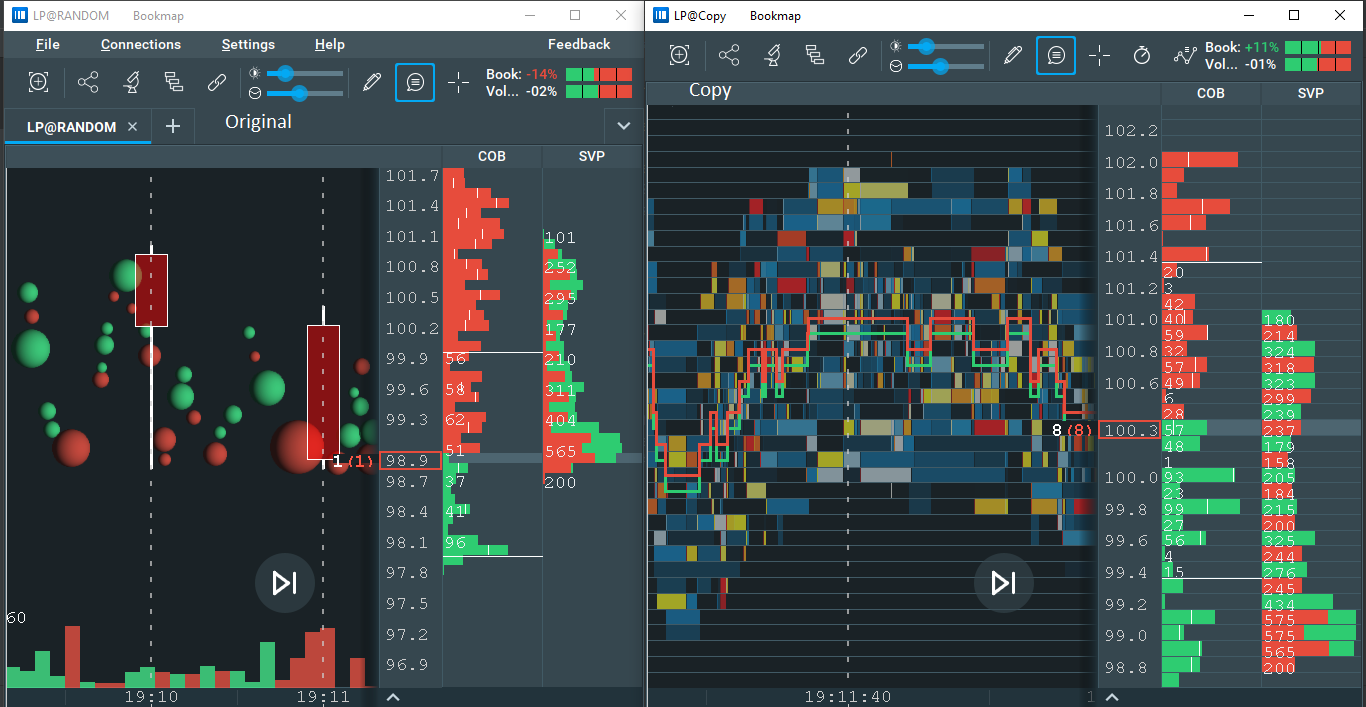 - Todos os dados preenchidos do instrumento original são agregados ao se tornar uma cópia e, portanto, não contêm eventos MBO. Isso significa que add-ons que dependem de dados MBO, como o SI On-Chart e o SI Sub-Chart, não exibirão nada ao usar dados preenchidos de cópias, mas funcionarão adequadamente usando quaisquer dados recebidos após o momento em que a cópia foi criada. Isso também significa que add-ons que agrupam eventos por tempo, como os indicadores Absorption e Sweeps, podem mostrar resultados que diferem do instrumento original ao usar dados preenchidos.