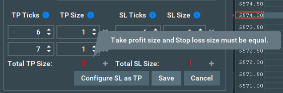 Esta configuração colocará 3 ordens de Take Profit, cada uma com um tamanho de 1 a 6, 8 e 10 ticks do nosso preço de entrada e uma única ordem de Stop Loss com um tamanho de 3 a 10 ticks do nosso preço de entrada. Note que o tamanho total no nível corresponde (Total TP igual ao total SL).