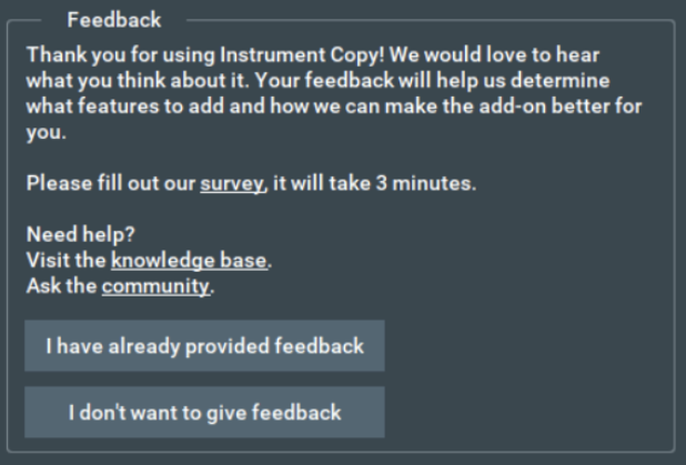 After one hour of using the add-on, you will see the feedback panel in the add-on configuration panel. If there is anything you think we could improve on, fix, or add, please let us know in the survey!
