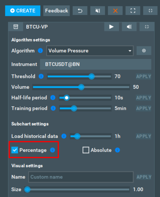 GO TO ➔ Orderbook Pressure algorithmThis section details the control elements for the Orderbook Pressure algorithm.