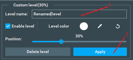 The Delete Level button removes the level from the main chart and deletes the setting panel for this level. If you want to disable the level but keep it for later, you can simply uncheck the “Enable Level” checkbox.